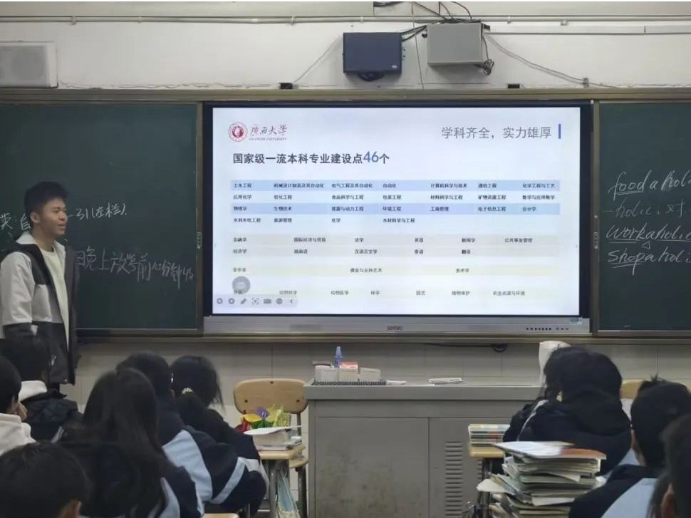 電自245班溫曜旭回到了高中母校,開(kāi)展廣西大學(xué)招生宣傳活動(dòng)。作為活動(dòng)負(fù)責(zé)人,他設(shè)立了風(fēng)雨棚宣講點(diǎn),解答高三學(xué)子的各類(lèi)疑問(wèn);深入班級(jí)宣講,分享大學(xué)生活與專業(yè)信息,激發(fā)同學(xué)們對(duì)未來(lái)的憧憬。他期盼更多學(xué)弟學(xué)妹報(bào)考廣西大學(xué),共譜人生新篇,并決心持續(xù)為招生宣傳助力,圓更多學(xué)子夢(mèng)想。