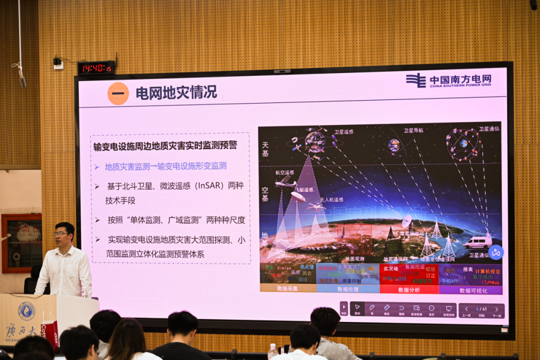 為提升我院學(xué)生工程應(yīng)用與實(shí)踐能力,了解當(dāng)下科研工作前沿,助力其成長成才,3月28日下午,我院在東10A-305教室舉行第7期“行業(yè)大咖進(jìn)課堂”暨電氣工程學(xué)科前沿講座。廣西電網(wǎng)公司電力科學(xué)研究院教授級高工黃志都受邀到我院為師生們作題為“電網(wǎng)地質(zhì)災(zāi)害監(jiān)測預(yù)警技術(shù)”的講座,我院2024級電氣工程專業(yè)全體博士、碩士及部分本科生共250余人參與講座。 黃志都高工正在授課 講座伊始,黃志都高工從電網(wǎng)輸電通道周邊地質(zhì)災(zāi)害情況切入,迅速吸引了同學(xué)們的注意力。隨后,他講述了基于北斗衛(wèi)星和微波遙感(InSAR)兩種技術(shù)手段的應(yīng)用方法,此方法能同時(shí)按照“單體監(jiān)測、廣域監(jiān)測”兩種尺度實(shí)現(xiàn)輸變電設(shè)施地質(zhì)災(zāi)害大范圍探測、小范圍監(jiān)測立體化監(jiān)測預(yù)警體系,并能夠?qū)崿F(xiàn)三維可視化展示。 黃志都高工介紹電網(wǎng)地災(zāi)情況 其中,InSAR遙感監(jiān)測技術(shù)的特點(diǎn)在于設(shè)計(jì)了輸變電設(shè)施地質(zhì)災(zāi)害監(jiān)測系統(tǒng)的架構(gòu),包括北斗實(shí)時(shí)單體監(jiān)測、遙感InSAR局域監(jiān)測和輸電桿塔三維可視化這三大基本模塊。黃志都高工結(jié)合廣西電網(wǎng)歷史地質(zhì)災(zāi)害情況,向同學(xué)們深入講解了InSAR遙感監(jiān)測的具體應(yīng)用案例,并清晰地展現(xiàn)了InSAR遙感監(jiān)測手段能夠針對每個(gè)遙感點(diǎn)生成不同顏色的標(biāo)識,以及相關(guān)地形變化數(shù)據(jù)和曲線。 同學(xué)們認(rèn)真聽課與做筆記 此次講座不僅拓寬了同學(xué)們的學(xué)術(shù)視野,激發(fā)了同學(xué)們對前沿技術(shù)的濃厚興趣和深入探索的動力。同時(shí),黃志都高工關(guān)于實(shí)踐經(jīng)驗(yàn)與行業(yè)洞察的分享,也為同學(xué)們未來的職業(yè)規(guī)劃提供了寶貴的指導(dǎo)和啟發(fā)。未來,學(xué)院將繼續(xù)開展“行業(yè)大咖進(jìn)課堂”系列活動,通過持續(xù)深化校企合作課程體系建設(shè),推動產(chǎn)學(xué)研協(xié)同發(fā)展,共同打造科技創(chuàng)新與高素質(zhì)人才培養(yǎng)的雙贏格局。