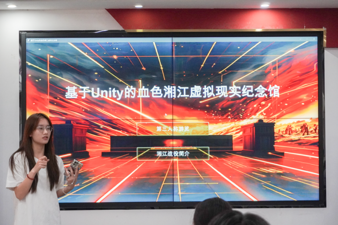 隨后,參與者們移步至馬克思主義學(xué)院5樓開(kāi)展紅色戰(zhàn)役知識(shí)競(jìng)答,并參觀(guān)了我院眾創(chuàng)空間研發(fā)的基于Unity的湘江戰(zhàn)役虛擬現(xiàn)實(shí)紀(jì)念館。該紀(jì)念館集成了紅色文化歷史文物畫(huà)作的虛擬展覽,AI數(shù)字人歷史知識(shí)語(yǔ)音問(wèn)答,3d還原歷史文物觀(guān)看,第三人稱(chēng)紀(jì)念漫游觀(guān)展,相關(guān)知識(shí)答題系統(tǒng)等多項(xiàng)功能