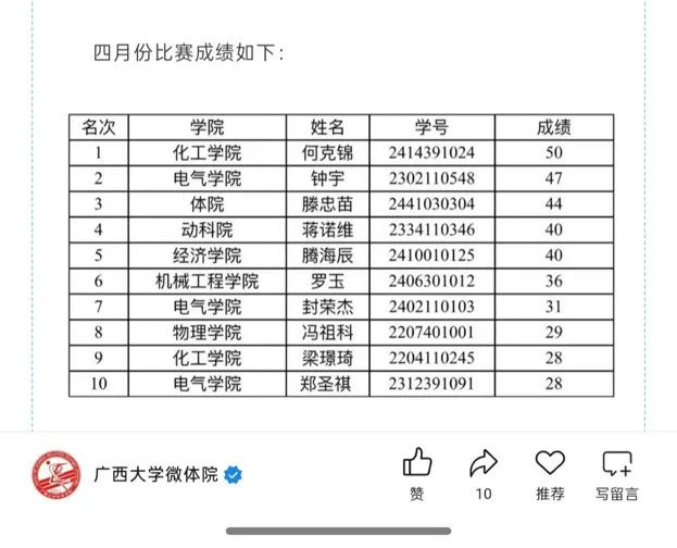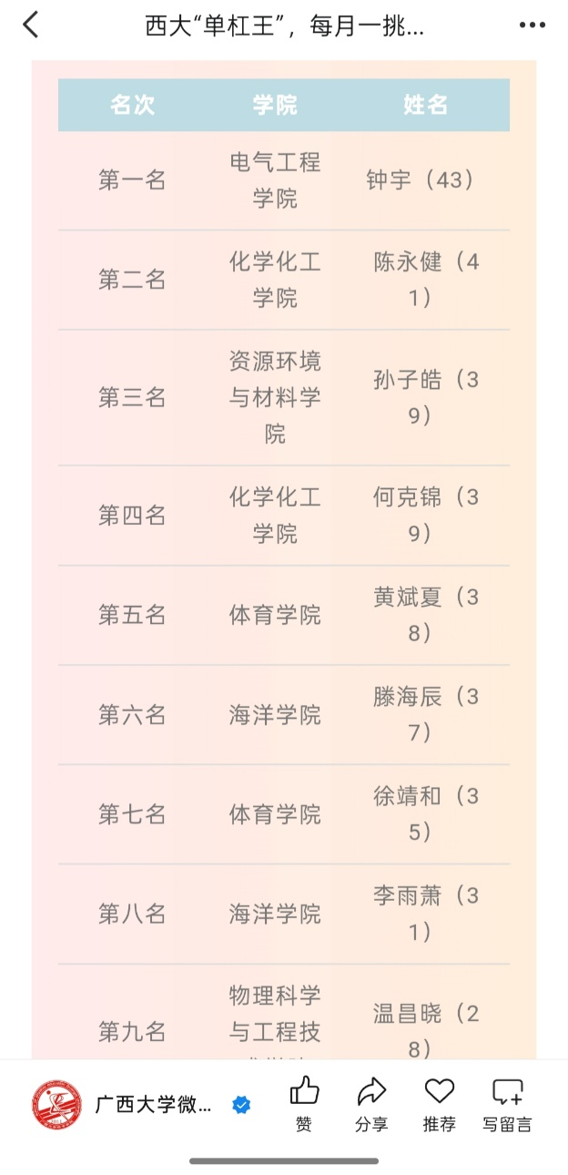 廣西大學首屆 “單杠王”挑戰(zhàn)賽于3月27日開賽,該活動每月開展一次競技比拼。電自235班鐘宇同學在3月、4月的挑戰(zhàn)中分別獲得第一名、第二名;研234班鄭圣祺同學獲得4月挑戰(zhàn)賽的第十名,展現(xiàn)電氣學子良好的精神風貌。