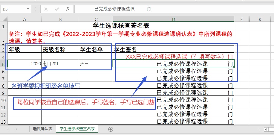 3、各班學(xué)委按班級(jí)名單填好《學(xué)生選課核查簽名表》(附件表格的第二個(gè)工作簿),中的“年級(jí)”“班級(jí)名稱”“學(xué)生名單”(即姓名)。各位同學(xué)核查后按要求簽名,格式“張三(手簽) 已完成必修課程選課 5(手填) 門”。如下圖
