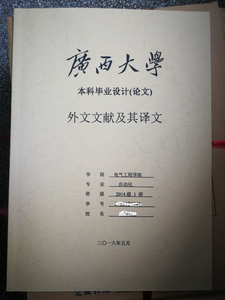 二、 外文翻譯采用學(xué)校要求的封皮紙張打印裝訂,英文原文在前,譯文在后。按規(guī)范要求用系統(tǒng)導(dǎo)出的帶水印底板,自己撰寫的版本,不能直接用系統(tǒng)導(dǎo)出的文檔。