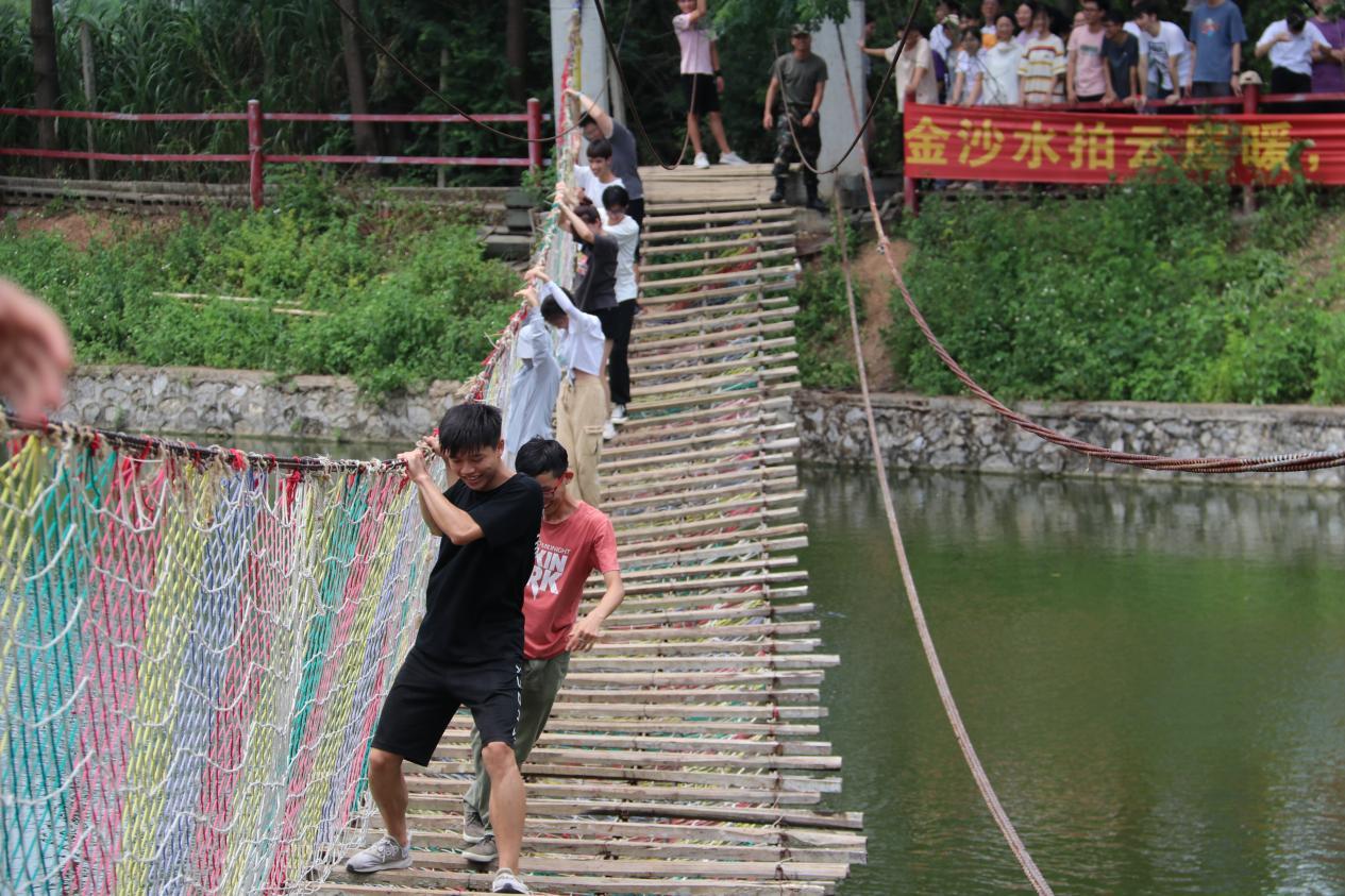 時光匆匆,轉(zhuǎn)眼便來到了下午。在教官的帶領(lǐng)下,一行人來到了“飛奪瀘定橋”的體驗地點。一眼望去,映入眼簾的便是幾條鐵索在空中搖蕩,只有幾塊木板交替搭建在鐵索之中。隊伍依次前行,渡橋搖搖晃晃,底下便是湖泊,仿佛回到了當(dāng)年紅軍飛奪瀘定橋的場景,在敵人的火力里,冒死搭橋,“大渡橋橫鐵索寒”。艱難爬過“瀘定橋”之后,心中對老紅軍的敬佩之情油然而生,實際地體會到了何為“長征精神”。