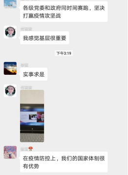 研究生193班徐丹陽(yáng)(湖北籍):四位老師分別從中國(guó)舉措、疫情啟示、歷史磨難、青春蝶變四個(gè)角度為我們深刻講解了當(dāng)下疫情的思考,也給了我很多啟發(fā)。
