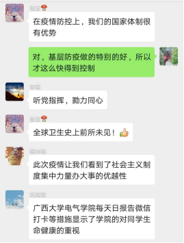 電氣類(lèi)185班學(xué)生: 通過(guò)這堂疫情防控思政大課,我們看到了在黨的領(lǐng)導(dǎo)下,基層黨組織雷利風(fēng)行,快速建立起了疫情防疫團(tuán)隊(duì)。全國(guó)各省相互支援,互幫互助。在這次疫情當(dāng)中,全國(guó)人民齊心協(xié)力共同抗疫,彰顯了中華民族偉大的團(tuán)結(jié)精神。黨和政府在這次疫情中發(fā)揮了巨大作用,體現(xiàn)了黨中央的應(yīng)變緊急情況能力,我們要總結(jié)歷史經(jīng)驗(yàn),堅(jiān)持黨的領(lǐng)導(dǎo)。
