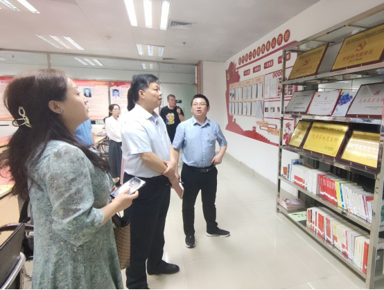 在雙方交流分享經(jīng)驗(yàn)之后,由梁志堅(jiān)書記帶領(lǐng)蔡曉琳書記一行人到綜合樓107黨員工作室、綜合樓110“三合一”紅色陣地與綜合樓105黨員創(chuàng)新活動(dòng)實(shí)踐基地進(jìn)行實(shí)地參觀,并由徐俊華書記對(duì)研二支部樣板支部建設(shè)成果進(jìn)行介紹。在參觀過程中,雙方領(lǐng)導(dǎo)表示研二支部推動(dòng)黨建工作和實(shí)踐工作深度融合的做法對(duì)黨建工作具有重要的教育意義,蔡曉琳書記也贊揚(yáng)了將支部活動(dòng)場(chǎng)地建設(shè)與實(shí)驗(yàn)室建設(shè)有機(jī)結(jié)合、紅色文化思想教育圍繞黨員生活實(shí)際的建設(shè)成果。