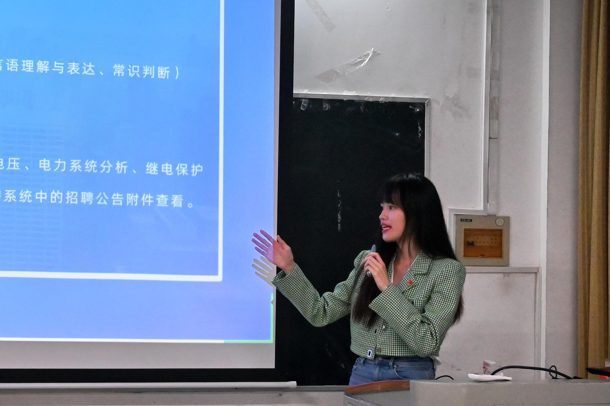 黃騫向學(xué)弟學(xué)妹們分享了自己在秋招參與南網(wǎng)招聘時(shí)的心得體會(huì),包括筆試、面試兩部分。她指出,大家要提前做好學(xué)業(yè)生涯規(guī)劃,在學(xué)生工作、學(xué)科競(jìng)賽、科研項(xiàng)目等賽道上走出屬于自己的特色道路,在長(zhǎng)期的積累和磨練中不斷培養(yǎng)核心競(jìng)爭(zhēng)力。同時(shí),在求職過(guò)程中要做到不驕不躁、不卑不亢,要以真誠(chéng)、積極陽(yáng)光的心態(tài)沉著應(yīng)對(duì)每一次挑戰(zhàn)。