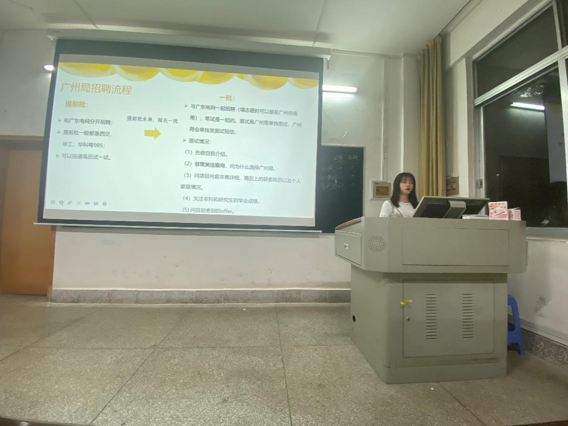 黃小倩同志已簽約南方電網(wǎng)南寧供電局,與我們分享了如何獲取就業(yè)信息、廣西電網(wǎng)招聘情況、廣西電網(wǎng)面試經(jīng)驗(yàn)、筆試經(jīng)驗(yàn)四個方面的內(nèi)容。談到如何獲取學(xué)校、學(xué)院發(fā)布的就業(yè)信息,黃小倩同志與我們分享了就業(yè)信息網(wǎng)和輔導(dǎo)員在群里發(fā)布的招聘信息兩個渠道,以及一些比較有用的微信公眾號。其次,黃小倩同志結(jié)合廣西電網(wǎng)的招聘情況和自身的面試過程,分享了如何在簡歷上突出個人優(yōu)勢,并叮囑求職者需要提前準(zhǔn)備面試問題以應(yīng)對考官提問。再者,黃小倩同志展示了部分面試時與考官的對話,告訴我們面試時需要注意的4個要求:1.不要緊張,實(shí)事求是。2.自我介紹流暢。3.善于表現(xiàn)自己的能力。4.謙遜、自信。最后,黃小倩同志分享了如何查找廣西電網(wǎng)公布的筆試信息、大綱,以及備考廣西電網(wǎng)筆試時需要提前準(zhǔn)備的資料。