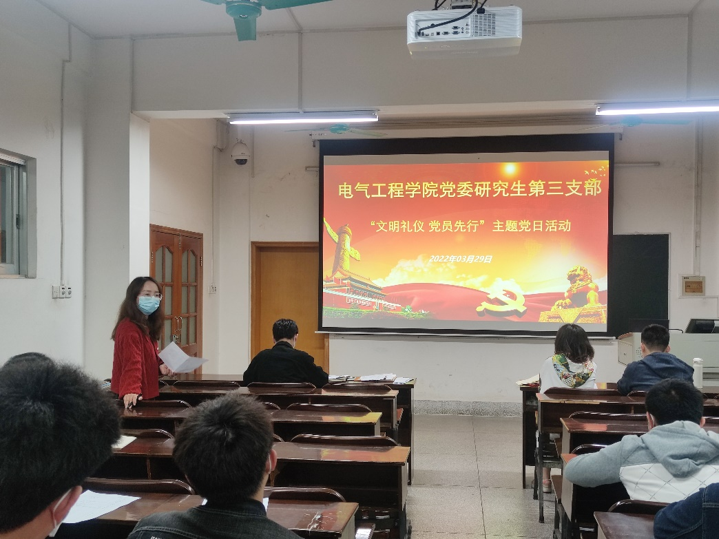 緊隨著開展了以“文明禮儀,黨員先行”為主題的黨日活動。活動旨在提高研究生個人禮儀修養(yǎng),加強研究生的自我規(guī)范、自我約束能力,能更好地幫助研究生實現(xiàn)自我價值,做到德才兼?zhèn)洹;顒咏Y束后,在座的黨員同志們表示在今后的學習生活中將會更加注重自身的禮儀教育,成為一位優(yōu)秀的高素質研究生。